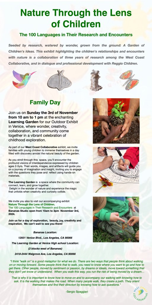 Join us on Sunday the 3rd of November from 10 am to 1 pm at the enchanting Learning Garden for our Outdoor Exhibit in Venice, where wonder, creativity, collaboration, and community come together in a vibrant celebration of childhood exploration.
